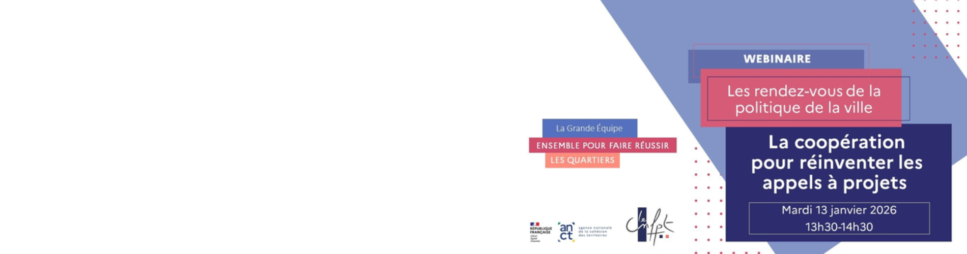 Les webinaires « Rendez-vous de la politique de la ville », organisés à l’initiative conjointe de l’ANCT et du CNFPT, offrent aux agents de l’État, des collectivités territoriales et plus largement aux professionnels de la politique de la ville, l’opportunité de découvrir de nouveaux outils, d’enrichir leurs pratiques et de s’inspirer d’expériences et d’initiatives innovantes.